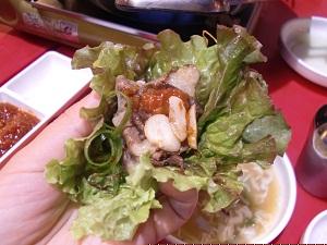 把肉跟蒜頭包在生菜裡一口咬下~~