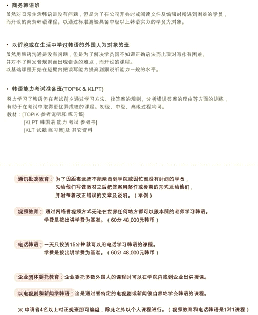 自1986年以來首爾韓國學院是堅持走韓語教育路線,並以院長多年教學經驗和教育方法為基礎的學院。我們一直在努力把前輩的教育方法傳授給後輩,並結合後輩的新方法是為了更好的韓語教育。我們不僅用純韓語教學方法,而且擁有會說一種以上外語的講師。他們能了解外國學員的問題與困難,並且站在學員的立場幫助他們充分理解。在1999年開設了教育部所認可的江南學院,並每月教200~300學生。之後因洞現出開設江北學院的學員請求,在2008年開設了鐘路校園。因此以漢江為中心,在江南,江北的語言中心建立了韓語教育殿堂,並成長為國內名副其實最頂尖的韓語的學校。首爾韓國語學院的教育實續是很難一一列舉,但會介紹富有代表性的機關。