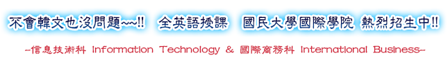 「正考慮能去韓國留學,但是還未具備可以聽課的韓文程度嗎」、「去語言學校太浪費時間,想要直接進大學就讀嗎」我要告訴這樣的您一個好消息。國民大學國際學院提供全英語授課,即使韓文能力不夠好也不用擔心。此學院分信息技術科(Information Technology)及國際商務科 (International Business)2個學科,可在4年內取得學位。當然也可以在選修科目選擇韓文授課的科目,所以在入學之後可以依照自己的計畫慢慢學好韓文。(有些學校會要求韓文能力必須到達檢定5級以上的程度,所以在進入大學就讀之前最少也必須先花個1年半到2年的時間去語言學校學韓文,等到取得學位就需要6年的時間)此外,奬學金的制度也非常完備,成績優秀的學生可以獲得學費全額補助的優惠。在學術方面,更提供大學三四年級的學生北美大學雙學位取得課程或Samsung或LG等大企業提供的有薪實習等多樣化的課程供學生選擇。
