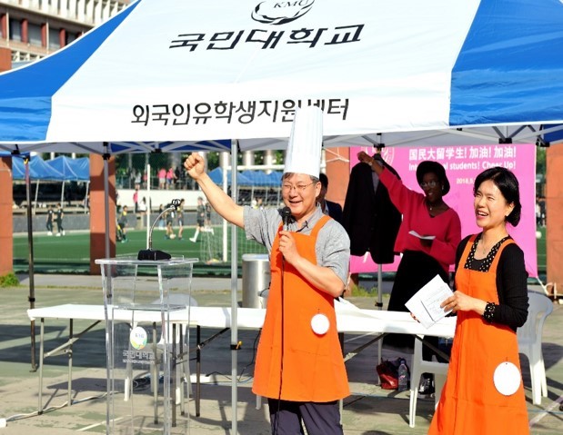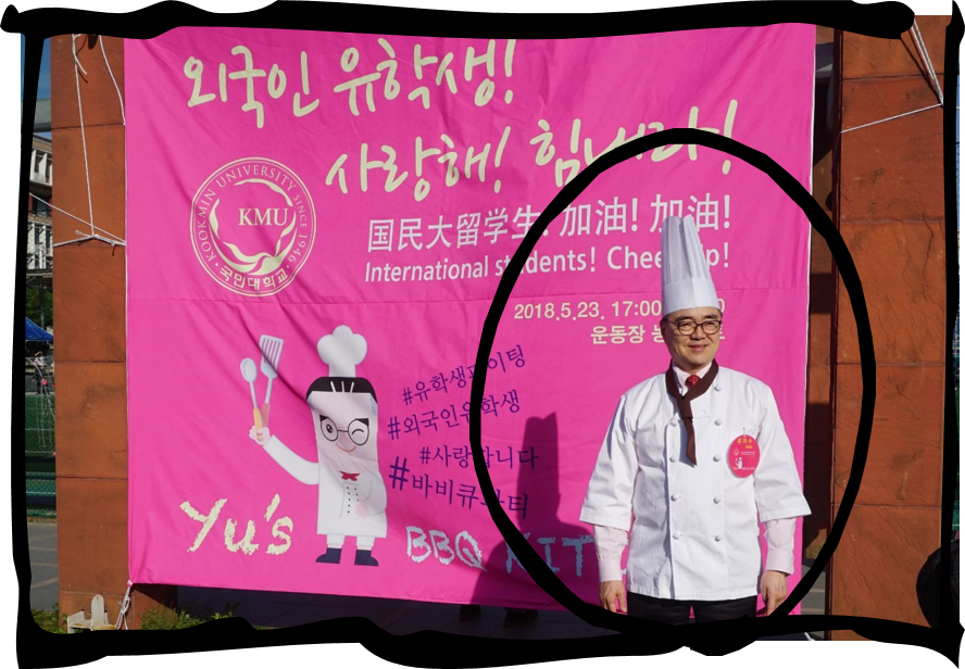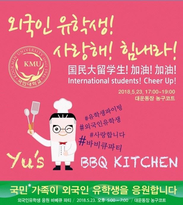 2018-06-12 有看過校長親自為留學生烤肉嗎? 這種畫面只有在國民大學才看的到!!!! 今年5月份國民大學為留學生舉辦了一場應援活動, 為了鼓勵在國民大學留學的外國學生們, 學校特別舉辦名為Yu’s BBQ Kitchen的活動!!
