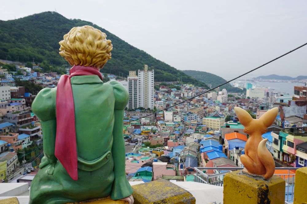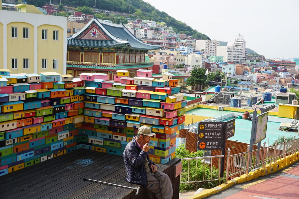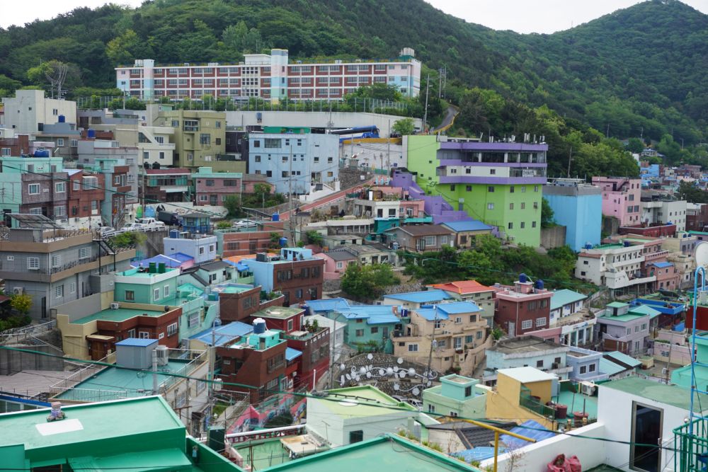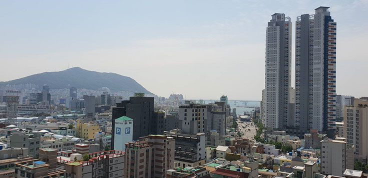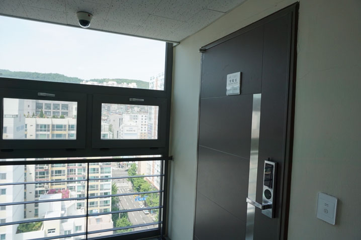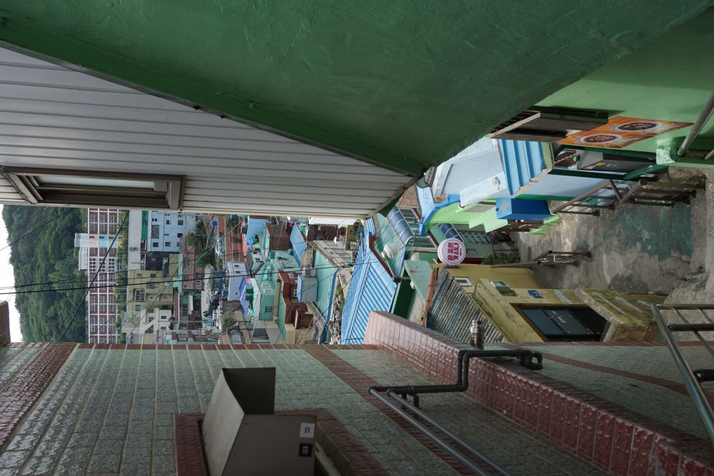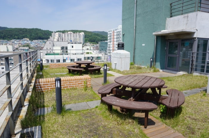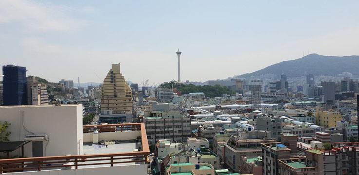 走廊的採光明亮,通風良好。走上頂樓,看到映入眼簾的景觀,驚呆了!很棒的空中花園,好適合來這邊放鬆、享受片刻悠閒,吃午餐。 放眼四周,甘川文化村、南浦洞、溫泉場纜車、釜山塔盡收眼底,如果有機會入住較高樓層的房間,也有機會獲得景觀美麗的一扇窗!所看見的景觀很美,老師還帶我們到頂樓,看出去的風景很遼闊!