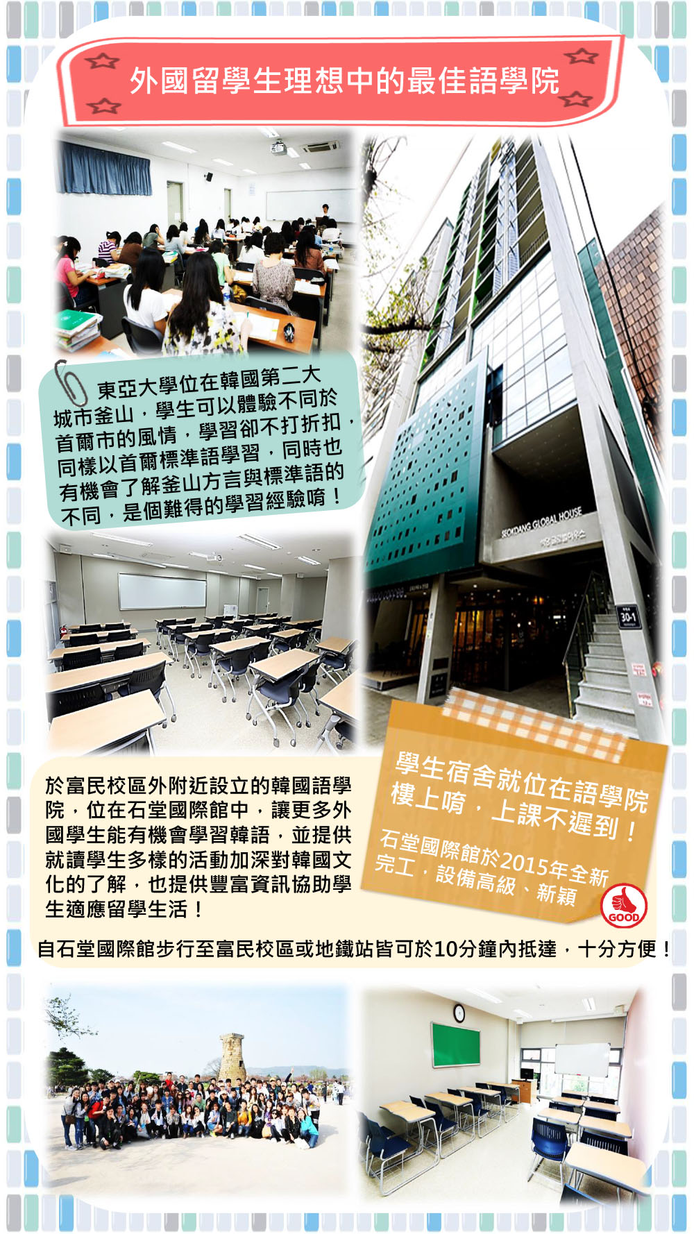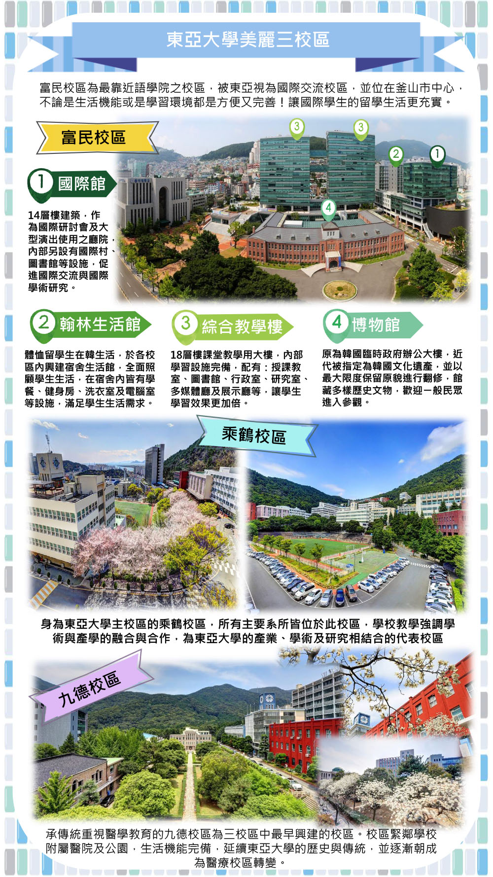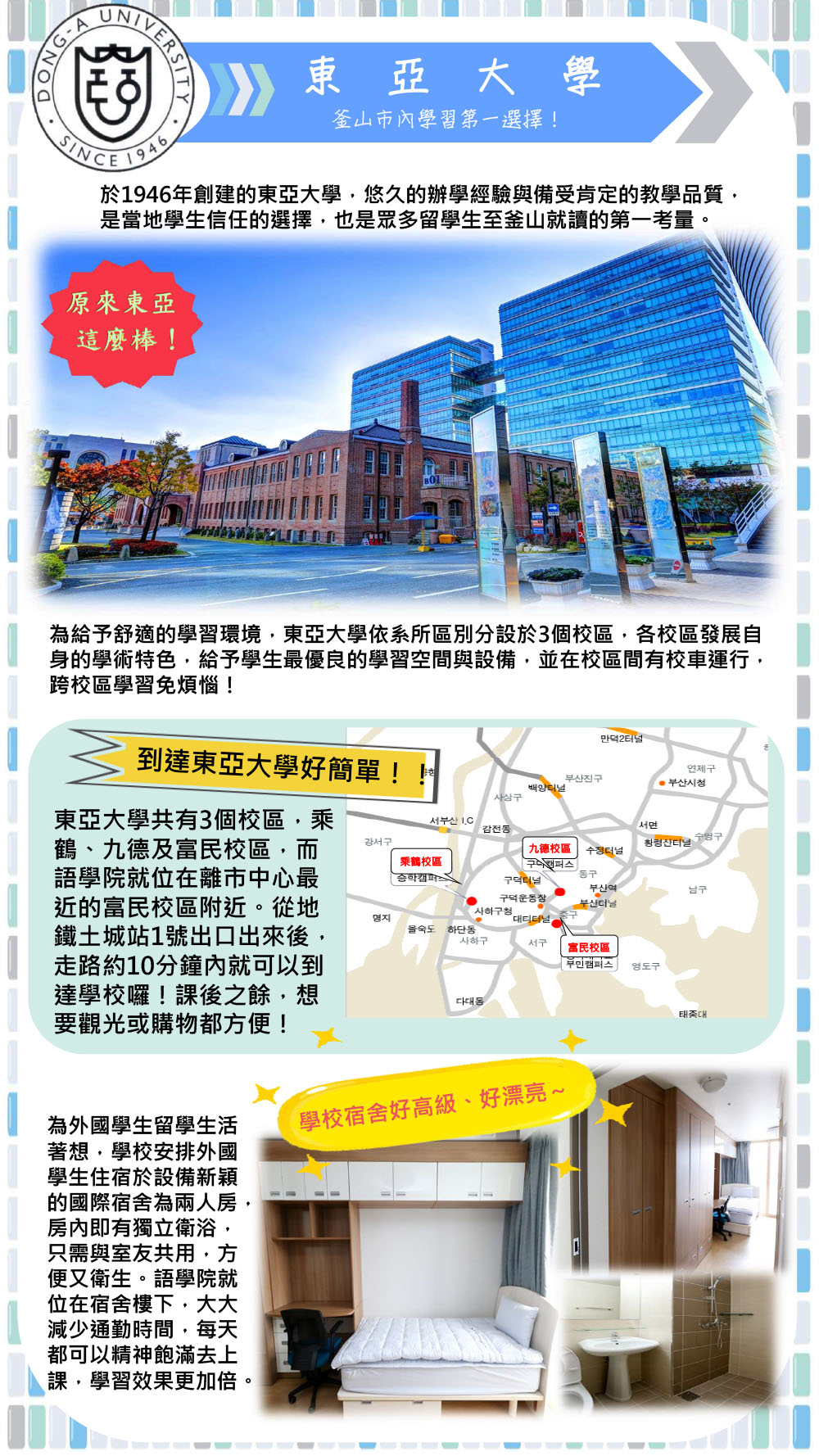 東亞大學位在釜山市,於1946年建校,與釜山大學同為釜山地區具代表性的優秀大學!東亞大學共有三大校區:乘鶴校區為學術與產學合作中心,主要系所均坐落於此;九德校區最早建成,逐漸轉型為醫療校區;富民校區位在釜山市中心,正是語學院所在校區。三校區間有免費校車通行,若是跨區上課或參與活動也不會有交通上的問題。 近年來東亞大學語學堂廣受台灣學生青睞,除多元豐富的授課內容外,每學期也會安排不同活動,例如園遊會、戲劇表演等等;在課程作業方面,也會給予多樣主題以增加學習韓文的趣味性,例如問卷調查分析、劇本編寫等。此外語學院使用的是自編教材,並配合課程內容安排不同老師授課,教學品質高。文化體驗與韓國學伴更是留學時不可或缺的經驗喔! 生活方面,宿舍與上課教室均於同一建築,可以睡飽再出門,讓同學充滿精神的上課!下課後步出校園就是熱鬧的釜山市區,有名的扎嘎其市場及南浦洞皆在步行可到之處。走路約10分鐘可至鄰近語學堂的地鐵1號線土城站,乘車、出遊等都非常便利。喜歡釜山的同學務必將東亞大學列入考量喔!