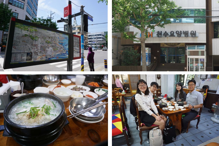 結束語言中心大樓的導覽後,我們先去吃午餐,老師帶我們去吃當地非常有名的人參雞湯,餐廳就在前往富民校區校園的路上,沿途中看到許多餐廳,附近也有醫院、三溫暖,還有看到路邊豎立的旅遊導覽地圖,真的生活機能很好!餐廳的選擇多樣,除了有當地的韓國料理以外,也有各樣的異國料理、亦或是熟悉的速食店可以選擇,因為是學校周邊,當然符合學生預算的平價餐廳也有許多。