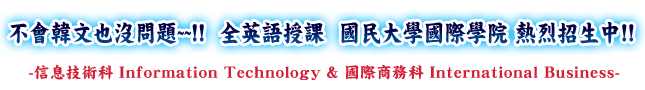 正考慮能去韓國留學,但是還未具備可以聽課的韓文程度嗎」、「去語言學校太浪費時間,想要直接進大學就讀嗎」我要告訴這樣的您一個好消息。國民大學國際學院提供全英語授課,即使韓文能力不夠好也不用擔心。此學院分信息技術科(Information Technology)及國際商務科 (International Business)2個學科,可在4年內取得學位。當然也可以在選修科目選擇韓文授課的科目,所以在入學之後可以依照自己的計畫慢慢學好韓文。(有些學校會要求韓文能力必須到達檢定5級以上的程度,所以在進入大學就讀之前最少也必須先花個1年半到2年的時間去語言學校學韓文,等到取得學位就需要6年的時間)此外,奬學金的制度也非常完備,成績優秀的學生可以獲得學費全額補助的優惠。在學術方面,更提供大學三四年級的學生北美大學雙學位取得課程或Samsung或LG等大企業提供的有薪實習等多樣化的課程供學生選擇。